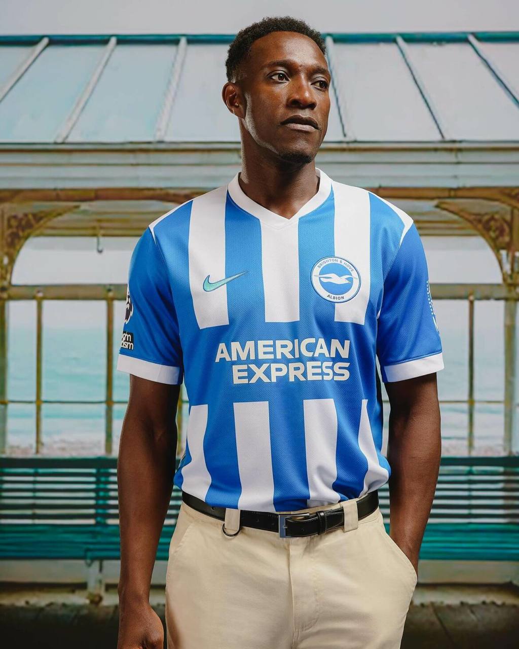 A camisa titular do Brighton & Hove Albion para a temporada 2025/26, fornecida pela Nike, mantém a tradicional combinação de listras verticais azuis e brancas. O design apresenta um painel central azul sólido, mangas azuis com punhos brancos e uma parte traseira predominantemente branca com listras azuis na parte inferior, criando uma continuidade visual.
