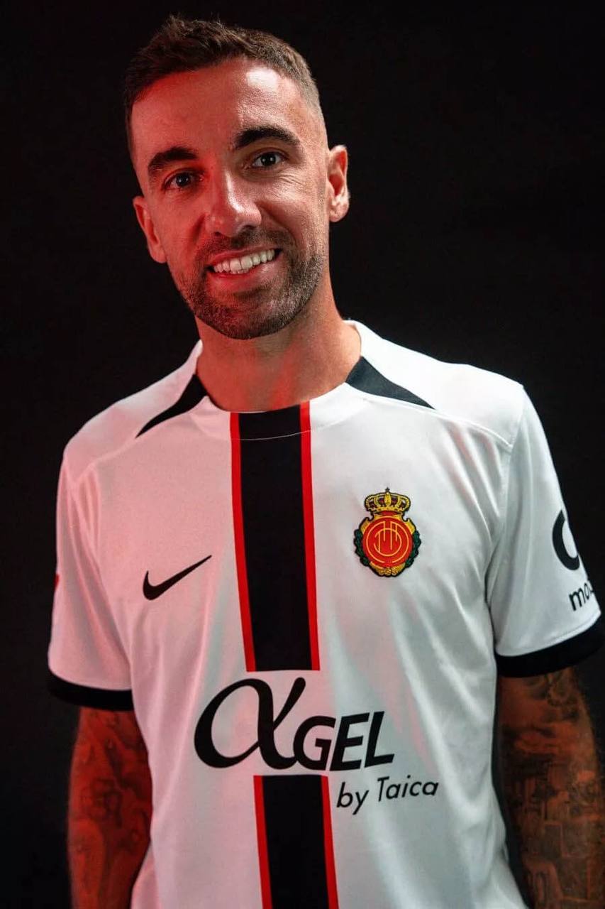 A Camisa RCD Mallorca II 2025/26 traz um design predominantemente branco com detalhes marcantes em vermelho e preto nas mangas e ombros, criando um contraste moderno e arrojado.