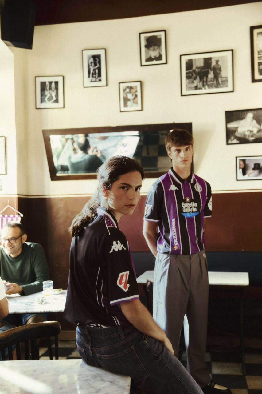 A Camisa Real Valladolid Away 2025/26, traz um visual marcante que combina modernidade e tradição. O modelo apresenta base preta com listras verticais roxas, contornadas por finas linhas brancas que valorizam o contraste e destacam as cores históricas do clube.