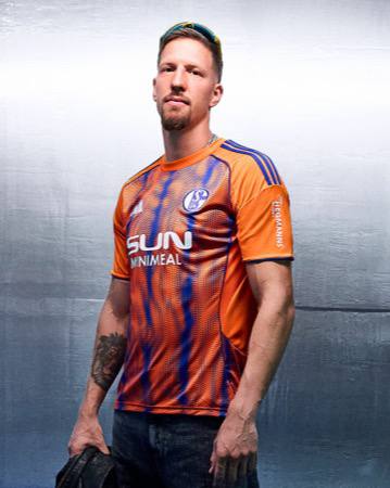 A Camisa Schalke 04 Third 2025/26, aposta em um visual chamativo: base laranja vibrante com um padrão gráfico em azul royal na parte frontal e detalhes que reforçam a identidade do clube. O design traz gola redonda canelada, corte ajustado e o escudo bordado no peito, criando um contraste moderno entre o laranja e o azul que agrada torcedores e colecionadores.