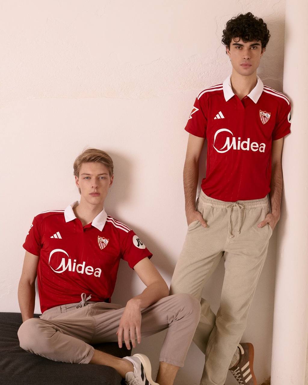 A Camisa Away do Sevilla FC 2025/26 traz um design que une tradição e modernidade. Com um tom de vermelho vibrante, a peça é complementada por detalhes em branco nas mangas, gola e logos, remetendo aos modelos clássicos da Adidas dos anos 70 e 80.